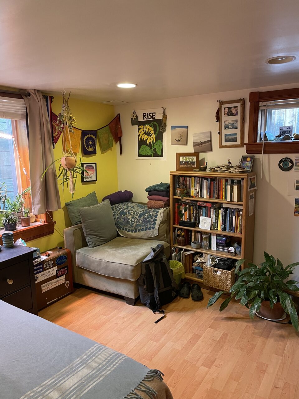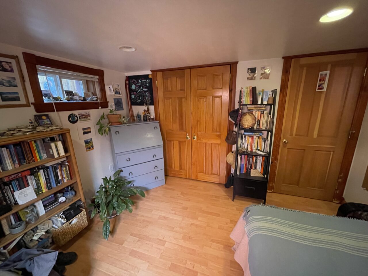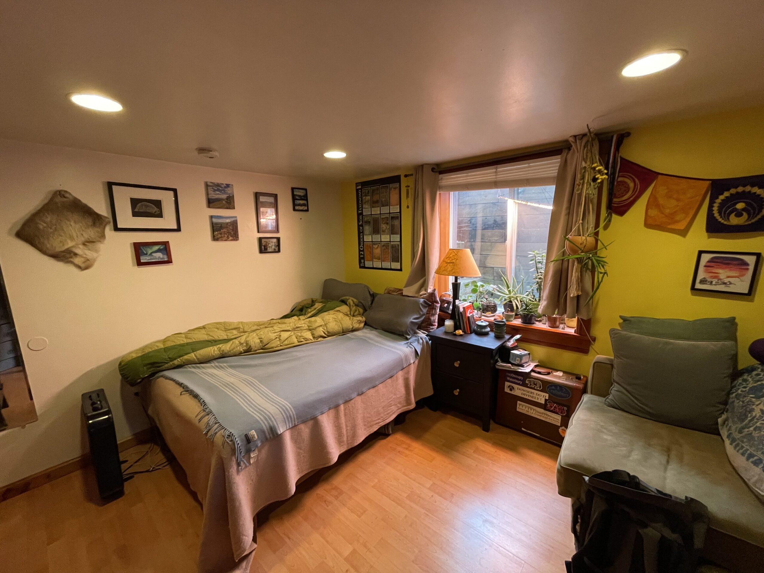 The available room is a downstairs northwest bedroom (10’ × 11’) with a built-in closet, offered unfurnished. Rent is $850 per month, all-inclusive—covering utilities, shared groceries, and co-op dues. Our home is located in the lower Chautauqua neighborhood.